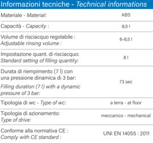 Cassetta WC angolare per installazione bassa a zaino o media posizione. Scocca in ABS con trattamento anti-invecchiamento, capacità 8L con possibilità di regolazione. Scarico singolo economizzatore d’acqua start/stop. Coibentazione anticondensa ed insonorizzante. Allacciamento idrico destro o sinistro. Galleggiante 3/8” compatto, rapido e silenzioso. Cassetta accessoriata di tubo di scarico (Rubinetto non incluso). I nostri prodotti sono Made in Italy e conformi agli standard europei. La cura dei dettagli, design e il rispetto della tradizione le caratteristiche che contraddistinguono Styletech nel mondo dell’arredo bagno.