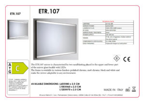Con la sua linea di specchi retroilluminati eleganti ed efficienti, Etrusca offre la soluzione ideale per il vostro arredo bagno. L’articolo ETR 107 ha dimensioni 100L x 60H ed è realizzato con un vetro da 4mm filo lucido con una cornice in colore Cromo Satinato e da due sabbiature. Dotato di retroilluminazione tramite striscia LED bianca 4000°K con un flusso luminoso di 2700 lumen presente lungo tutta la bordatura del telaio. Fornito con alimentatore da 12V integrato dietro il pannello dello specchio. Certificato con classe energetica C, di isolamento 3 e grado di protezione IP44, è il prodotto ideale per ambienti umidi e poco illuminati. Tutti gli specchi Estrusca sono 100% Made in Italy.