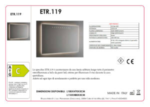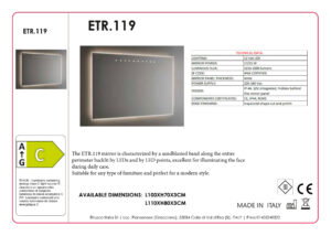 Con la sua linea di specchi retroilluminati eleganti ed efficienti, Etrusca offre la soluzione ideale per il vostro arredo bagno. L’articolo ETR 119 ha dimensioni 100L x 70H ed è realizzato con un vetro da 4mm filo lucido con punti led e sabbiatura perimetrale. Dotato di retroilluminazione tramite striscia LED bianca 4000°K con un flusso luminoso di 3210 lumen presente lungo tutta la bordatura del telaio. Fornito con alimentatore da 12V integrato dietro il pannello dello specchio. Certificato con classe energetica C, di isolamento 3 e grado di protezione IP44, è il prodotto ideale per ambienti umidi e poco illuminati. Tutti gli specchi Estrusca sono 100% Made in Italy.