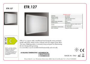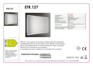 Con la sua linea di specchi retroilluminati eleganti ed efficienti, Etrusca offre la soluzione ideale per il vostro arredo bagno. L’articolo ETR 127 ha dimensioni 60L x 80H ed è realizzato con un vetro da 4mm filo lucido con una sabbiatura perimetrale. Dotato di retroilluminazione tramite striscia LED bianca 4000°K con un flusso luminoso di 1840 lumen presente lungo tutta la bordatura del telaio. Fornito con alimentatore da 12V integrato dietro il pannello dello specchio. Certificato con classe energetica C, di isolamento 3 e grado di protezione IP44, è il prodotto ideale per ambienti umidi e poco illuminati. Grazie alla presenza dei gangi su entrambi i lati, l’articolo può essere montato sia in orizzontale che in verticale a seconda delle esigenze. Tutti gli specchi Estrusca sono 100% Made in Italy.