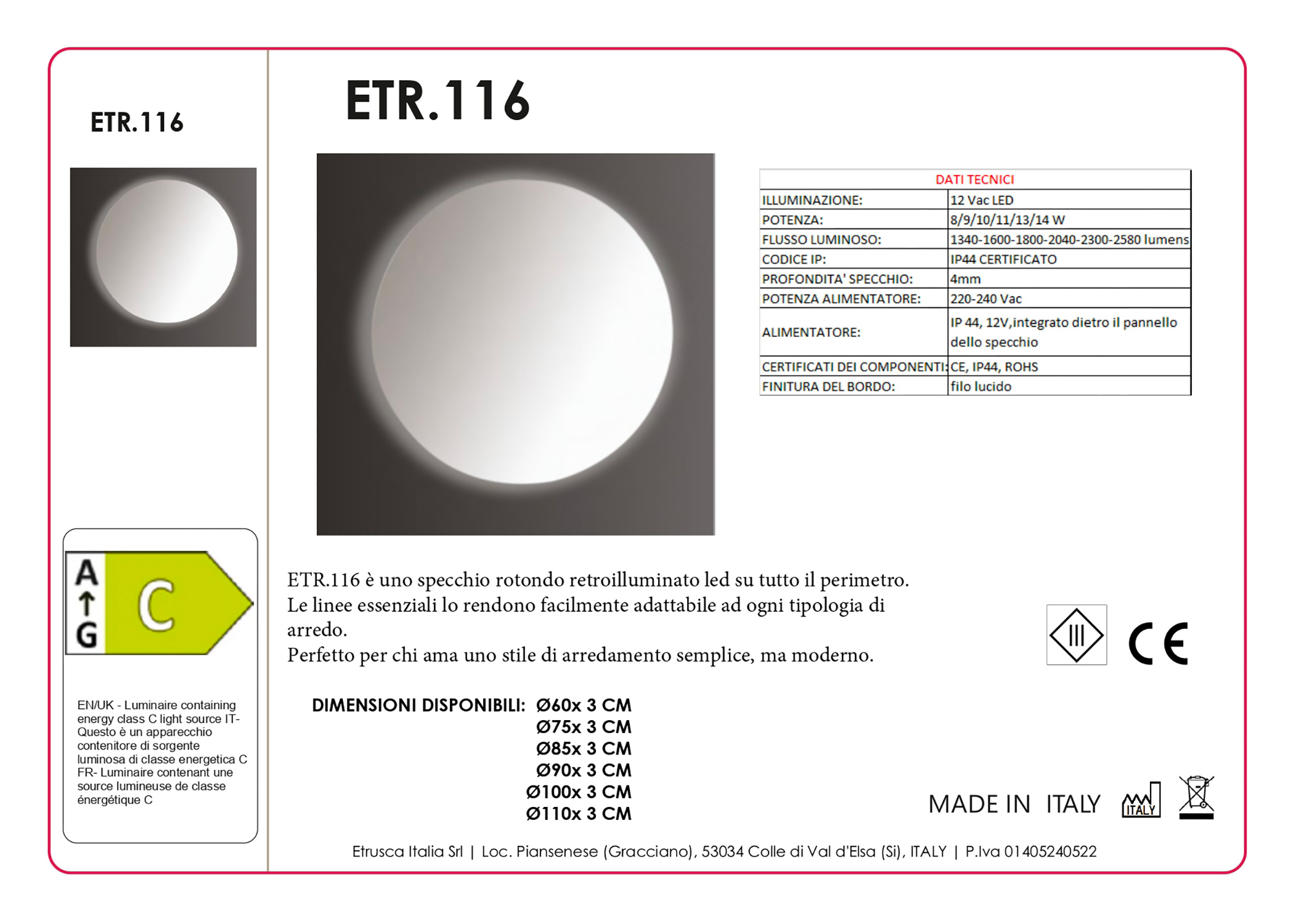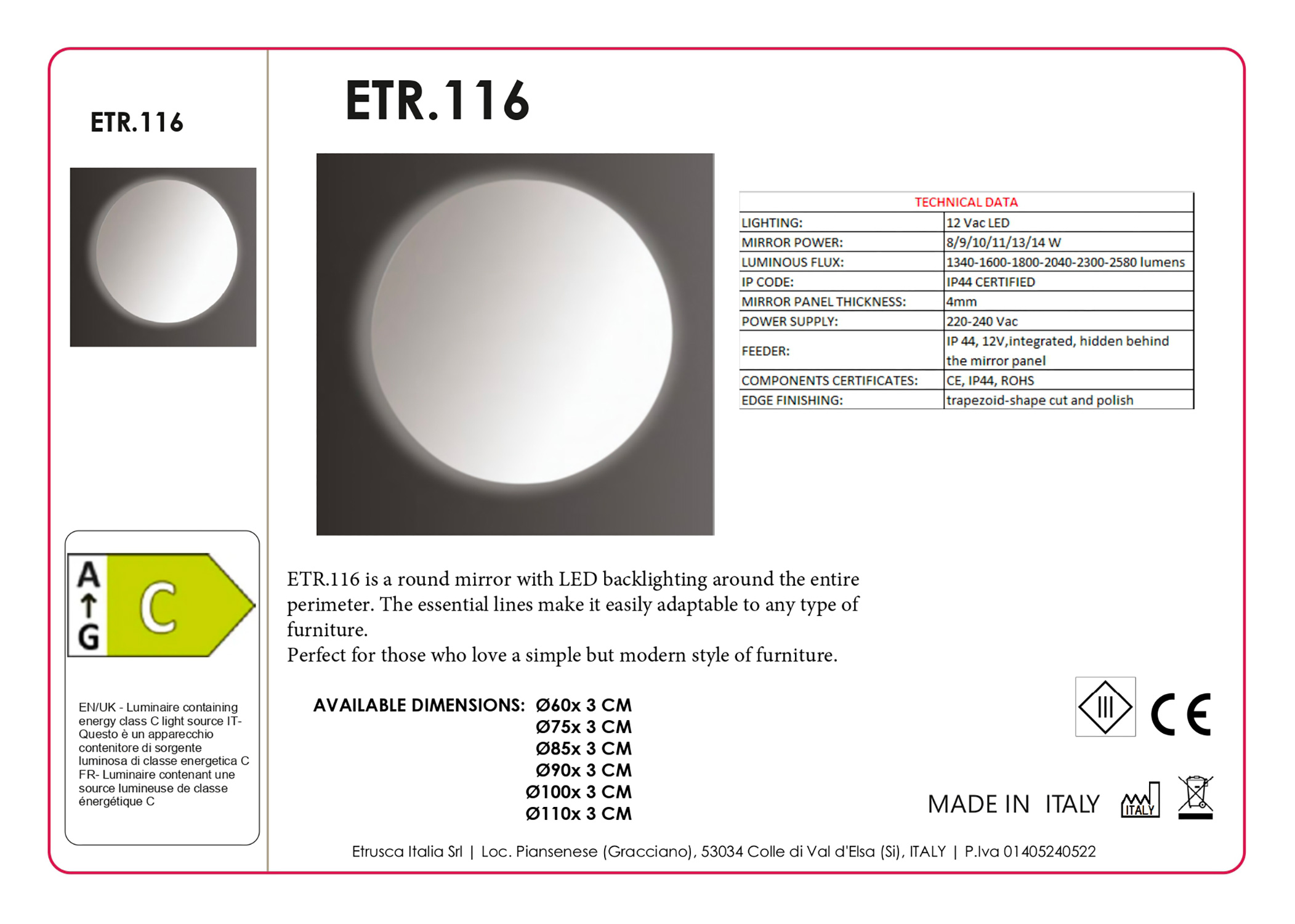 Con la sua linea di specchi retroilluminati eleganti ed efficienti, Etrusca offre la soluzione ideale per il vostro arredo bagno. L’articolo ETR 116 ha un diametro di 75 cm ed è realizzato con un vetro da 4mm filo lucido. Dotato di retroilluminazione tramite striscia LED bianca 4000°K con un flusso luminoso di 1600 lumen presente lungo tutta la bordatura del telaio. Fornito con alimentatore da 12V integrato dietro il pannello dello specchio. Certificato con classe energetica C, di isolamento 3 e grado di protezione IP44, è il prodotto ideale per ambienti umidi e poco illuminati. Tutti gli specchi Estrusca sono 100% Made in Italy.