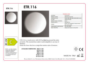 Con la sua linea di specchi retroilluminati eleganti ed efficienti, Etrusca offre la soluzione ideale per il vostro arredo bagno. L’articolo ETR 116 ha un diametro di 90 cm ed è realizzato con un vetro da 4mm filo lucido. Dotato di retroilluminazione tramite striscia LED bianca 4000°K con un flusso luminoso di 2040 lumen presente lungo tutta la bordatura del telaio. Fornito con alimentatore da 12V integrato dietro il pannello dello specchio. Certificato con classe energetica C, di isolamento 3 e grado di protezione IP44, è il prodotto ideale per ambienti umidi e poco illuminati. Tutti gli specchi Estrusca sono 100% Made in Italy.
