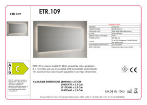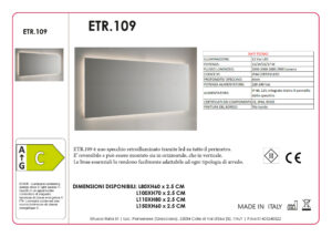 Con la sua linea di specchi retroilluminati eleganti ed efficienti, Etrusca offre la soluzione ideale per il vostro arredo bagno. L’articolo ETR 109 ha dimensioni 100L x 70H ed è realizzato con un vetro da 4mm filo lucido. Dotato di retroilluminazione tramite striscia LED bianca 4000°K con un flusso luminoso di 2460 lumen presente lungo tutta la bordatura del telaio. Fornito con alimentatore da 12V integrato dietro il pannello dello specchio. Certificato con classe energetica C, di isolamento 3 e grado di protezione IP44, è il prodotto ideale per ambienti umidi e poco illuminati. Grazie alla presenza dei gangi su entrambi i lati, l’articolo può essere montato sia in orizzontale che in verticale a seconda delle esigenze. Tutti gli specchi Estrusca sono 100% Made in Italy.