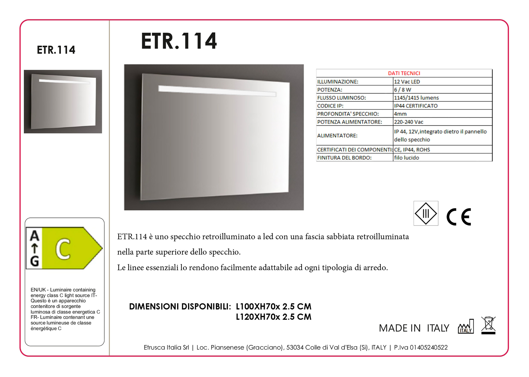 Con la sua linea di specchi retroilluminati eleganti ed efficienti, Etrusca offre la soluzione ideale per il vostro arredo bagno. L’articolo ETR 114 ha dimensioni 100L x 70H ed è realizzato con un vetro da 4mm filo lucido con una fascia sabbiata. Dotato di retroilluminazione tramite striscia LED bianca 4000°K con un flusso luminoso di 1145 lumen. Fornito con alimentatore da 12V integrato dietro il pannello dello specchio. Certificato con classe energetica C, di isolamento 3 e grado di protezione IP44, è il prodotto ideale per ambienti umidi e poco illuminati. Tutti gli specchi Estrusca sono 100% Made in Italy.