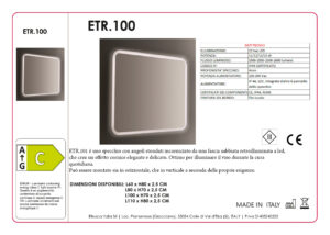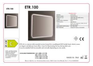 Con la sua linea di specchi retroilluminati eleganti ed efficienti, Etrusca offre la soluzione ideale per il vostro arredo bagno. L’articolo ETR 100 ha dimensioni 60L x 80H ed è realizzato con un vetro da 4mm filo lucido con angoli stondati e sabbiatura perimetrale. Dotato di retroilluminazione tramite striscia LED bianca 4000°K con un flusso luminoso di 1900 lumen presente lungo tutta la bordatura del telaio. Fornito con alimentatore da 12V integrato dietro il pannello dello specchio. Certificato con classe energetica C, di isolamento 3 e grado di protezione IP44, è il prodotto ideale per ambienti umidi e poco illuminati. Grazie alla presenza dei gangi su entrambi i lati, l’articolo può essere montato sia in orizzontale che in verticale a seconda delle esigenze. Tutti gli specchi Estrusca sono 100% Made in Italy.