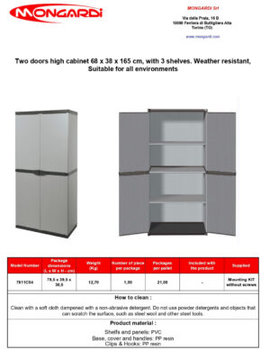 La struttura è realizzata in PVC riciclato e PP di seconda vita e ha dimensioni: L68 x P39,5 x H165 con una capacità di carico di 20 kg per ripiano. L’articolo fa parte della serie Modular System, è quindi predisposto ad essere unito in serie ad altri articoli della linea Storage a marchio Mongardi. Fornito in Kit di montaggio a incastro e con Kit di fissaggio a parete, è dotato di due ante a chiusura battente con mobilità di 180°. Risolve il problema della ruggine e dell’umidità in ambienti come garage, lavanderie, giardini e terrazze. I nostri prodotti sono 100% Made in Italy.