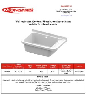 Il pilozzo a muro 7832C98 in PP di colore bianco, ha dimensioni 60 x 40 x 25cm. E’ comprensivo di kit di fissaggio a muro (Viti e tasselli), kit di scarico autopulente (Sifone, Piletta e Troppopieno), ed è forabile sul lato destro per l’inserimento di un miscelatore (non incluso). La sua resistenza agli agenti atmosferici e agli acidi per utilizzo domestico, lo rendono il prodotto ideale per lavanderie, giardini, terrazze e garage. I nostri prodotti sono 100% Made in Italy.