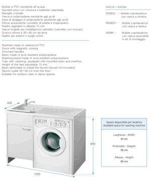 Il mobile coprilavatrice 9008K si presenta in resina PVC di colore bianco con 18 mm di spessore e apertura a doppia anta con maniglie in ABS cromato e chiusura battente. Il mobile ha dimensioni 109 x 60 x 89cm ed è fornito in kit di montaggio. Incluso con il prodotto il kit completo di fissaggio al muro (Viti e tasselli) e di scarico autopulente (Sifone, Piletta e troppopieno). La vasca in PP con dimensioni 109X60 cm è resistente a tutti i detergenti e gli acidi di uso domestico. La vasca è predisposta per l’installazione di un miscelatore monoforo a destra o a sinistra (non incluso). Grazie alla sua resistenza all’umidità e agli agenti atmosferici è il prodotto ideale per ambienti interni ed esterni.