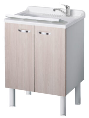 Il mobile lavatoio 6002SKOL in nobilitato idrofugo W100 di colore olmo, è costiuito da pannelli di 18 mm di spessore. Dotato di una doppia anta a chiusura battente e maniglie in ABS cromato. Il mobile ha dimensioni 60x50x85H cm con piedini regolabili in altezza (15 mm) ed è adatto a diverse tipologie di ambienti interni quali: Garage, Lavanderia e Cantina. Incluso con il prodotto il sistema di scarico autopulente (Sifone, Piletta e Troppopieno) e un asse di lavaggio in resina PP. La vasca in Polipropilene (PP) con dimensioni 60×50 cm è resistente a tutti i detergenti e gli acidi di uso domestico. La vasca è predisposta per l’installazione di un miscelatore monoforo a destra o a sinistra (Non incluso).