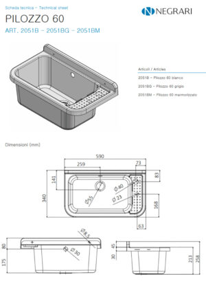Con il pilozzo a muro 2051B in resina PP di colore grigio lucido, Negrari offre un prodotto resistente nel tempo ad un ottimo prezzo. Fabbricato con materia prima vergine, ha dimensioni 60 x 34 x 21 cm ed è comprensivo di kit di fissaggio a muro (Viti e tasselli) e kit di scarico autopulente (Sifone, Piletta e Troppopieno). Grazie alla sua resistenza agli agenti atmosferici e agli acidi di uso domestico, lo rendono il prodotto ideale per (Lavanderia, Giardini, Terrazze e Garage).