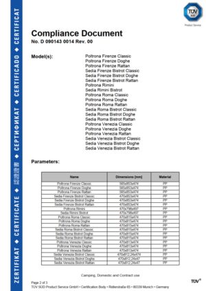 La sedia Venezia viene prodotta con polipropilene di alta qualità che le conferisce un’eccellente resistenza all’uso quotidiano e agli agenti atmosferici. Adatta per molteplici ambienti quali: sala da pranzo, soggiorno, patio, giardino e terrazze, è la sedia ideale per diverse tipologie di utilizzi. Insieme a tutta la linea Opera, la sedia è certificata TUV Sud garantendo così un livello qualitativo ben definito e testato da un laboratorio specializzato. Grazie ad un processo di produzione eco-compatibile che utilizza materiale riciclato, i prodotti di Opera Plastica sono 100% Made in Italy e sono ideati nel rispetto dell’ambiente